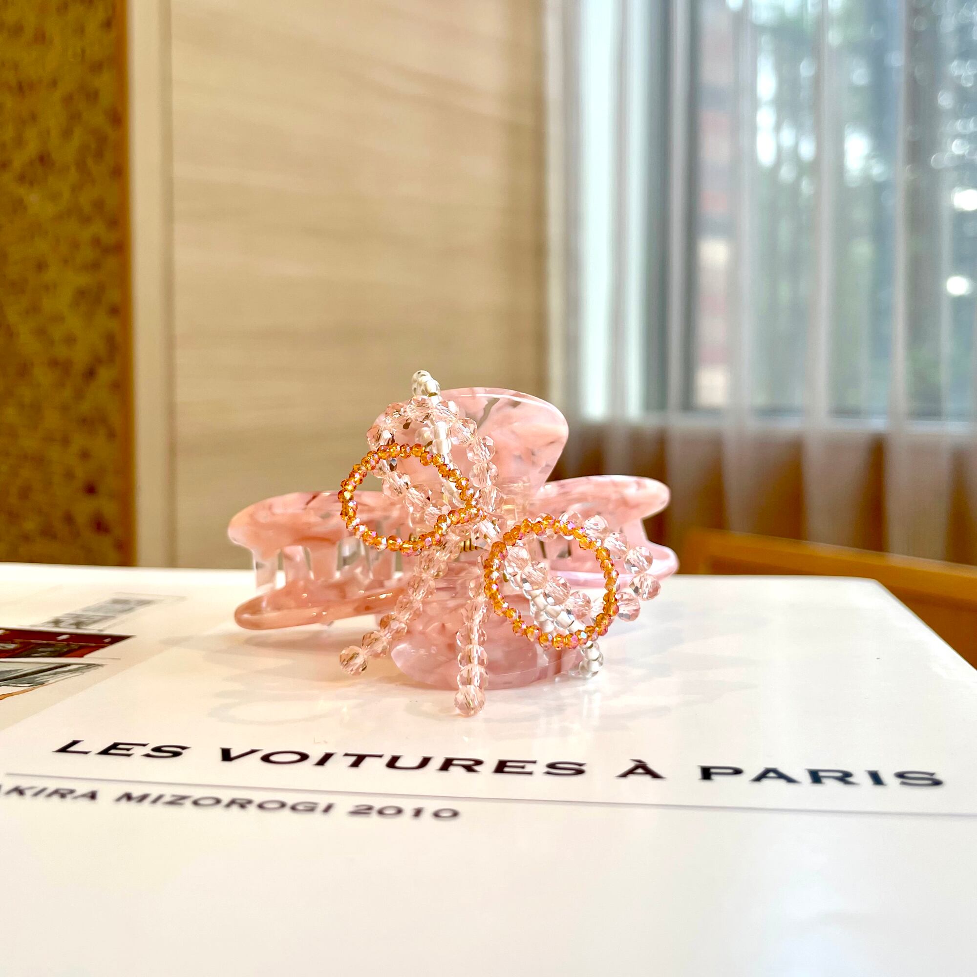 高品質ガラスビーズで作られたリボンモチーフが上品に輝き、甘いリボンもシックに仕上がりました。バンスクリップとビジュリボンの色合いを同色に合わせ、スタイリッシュに引き締め、立体感あるデザインでエレガントに演出。色違いでも揃えたくなる主役級アイテムです。