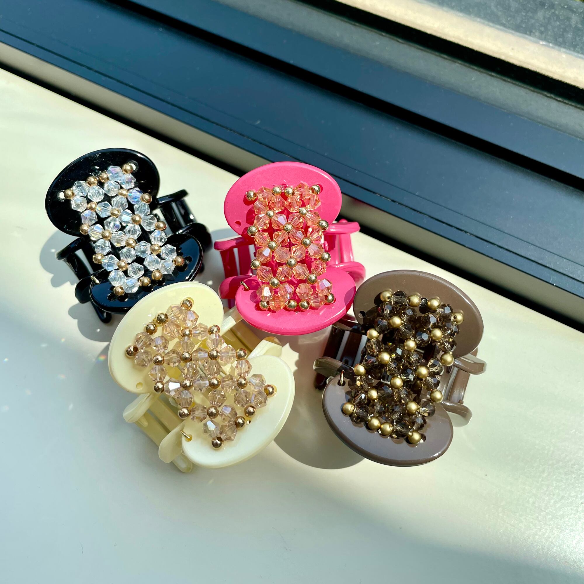 そろばん型の高品質ガラスビーズを、ひとつひとつ手作業で編み込み、どんなファッションにも馴染むスタイリッシュなデザインが完成しました。そろばん型のカットが光を反射し、角度によって優しく輝きます。