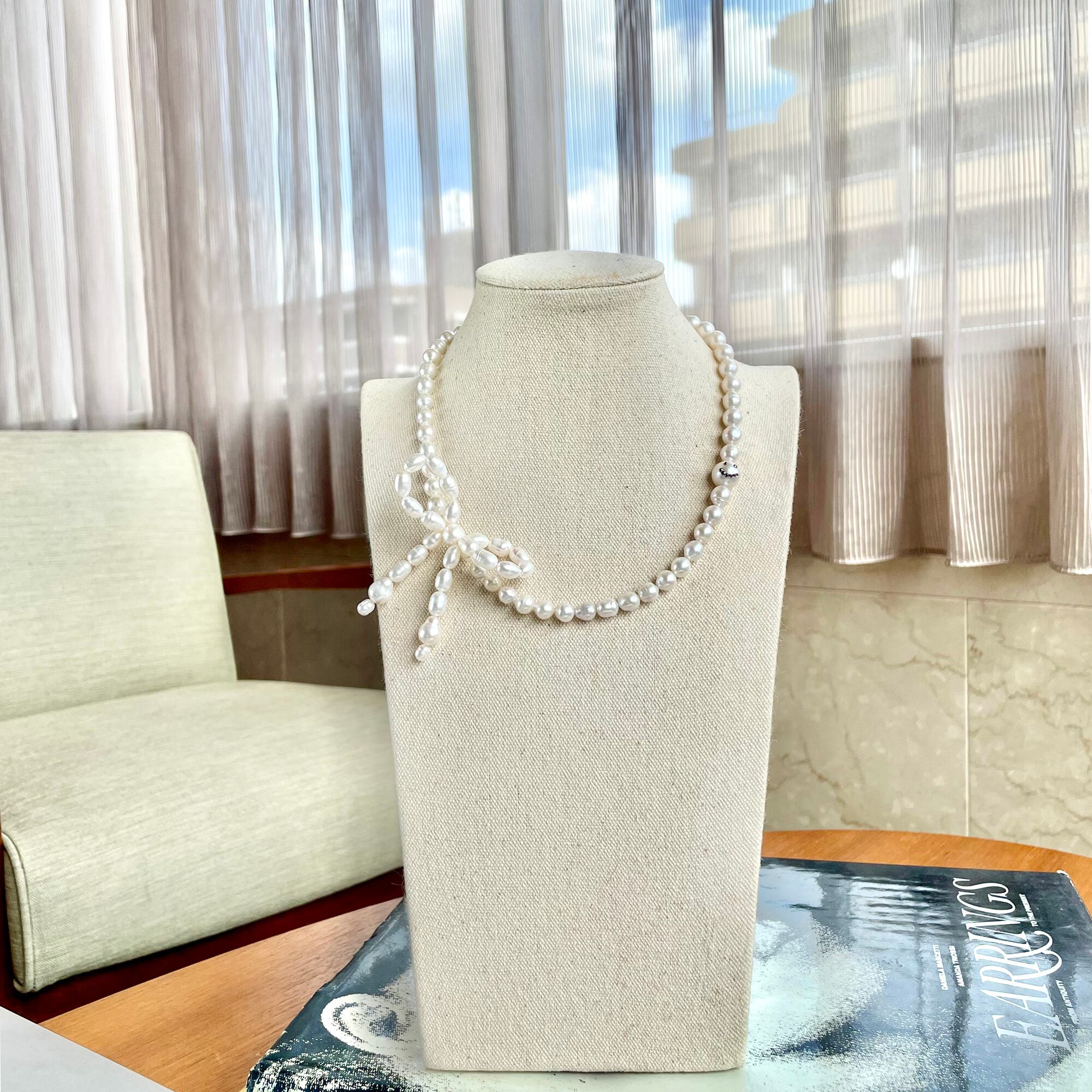 淡水本真珠をリボンに連ねネックレスにしました。上品な印象の淡水パールに可愛さが足され、印象的なデザインとなりました。