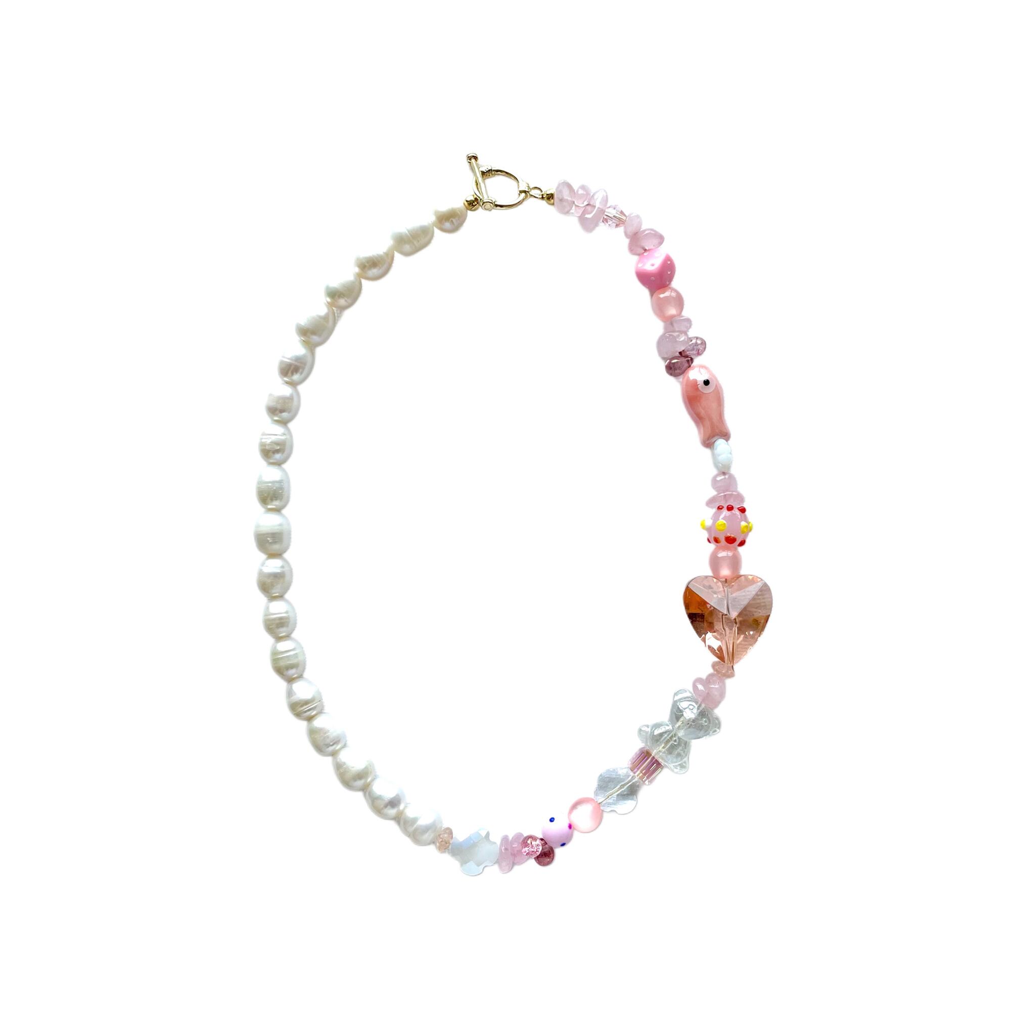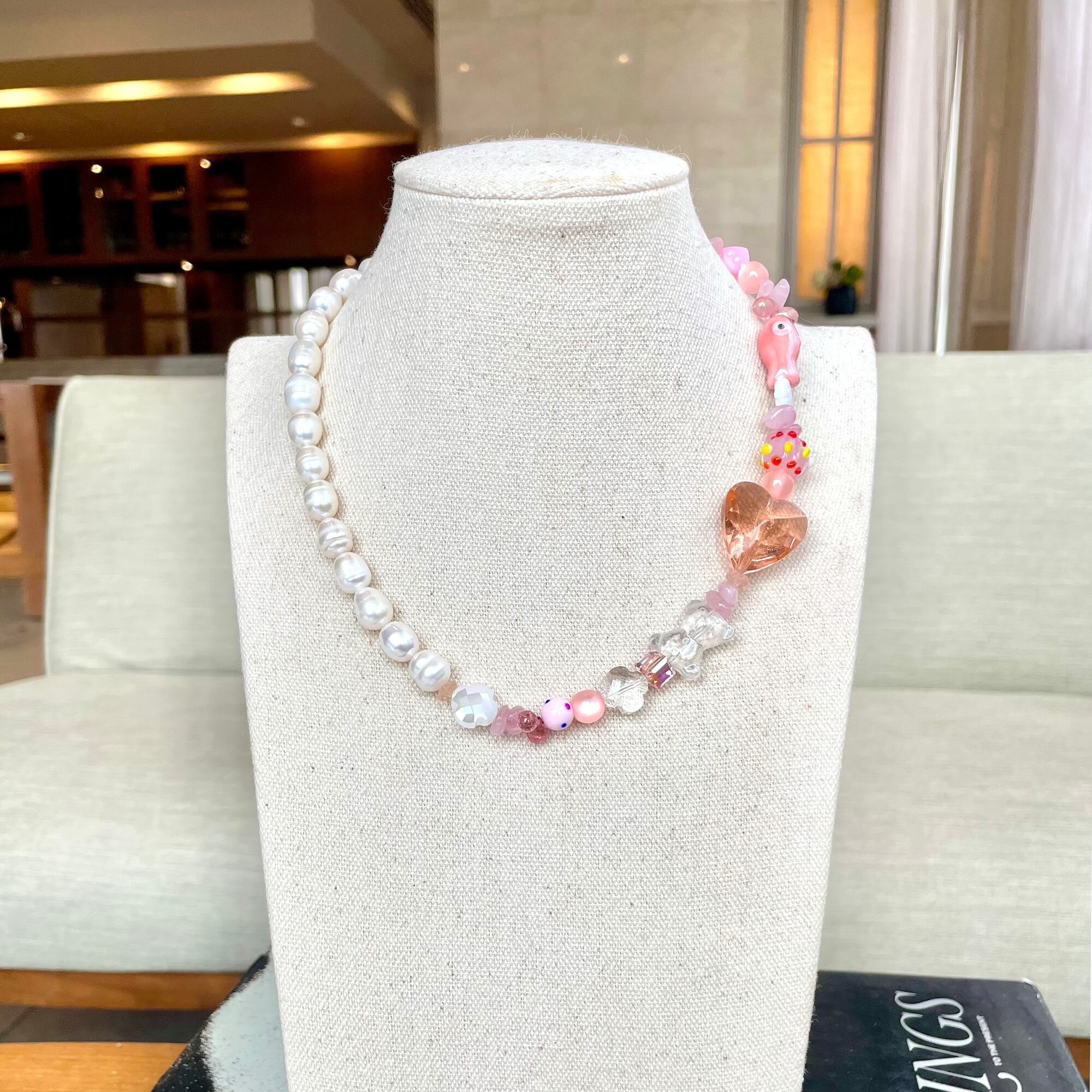淡水本真珠、天然石にガラスアート、陶器のお魚や大きなハート、チェコビーズくまちゃんを組み合わせデザインされたこちらのネックレスは、個性派のあなたにぴったりな一品です。可愛いモチーフを使っていますが、どこか大人っぽさも感じる。不思議なネックレスが完成しました。